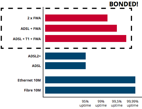 Network reliability is increasingly important as the business world expands beyond the bricks and mortar of your office. Bonded Internet is your ideal solution if you’re adopting cloud or hosted applications. Consider it your outage insurance.